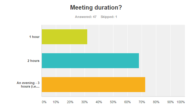 - If anything, clearer expectations of meeting content would be really nice. It would allow me to better decide whether to go or not – especially if the meeting frequency would go up (which I’d prefer). So for example, if someone was really into a particular subject, then they could get together and I would know better up front what the subject was really about